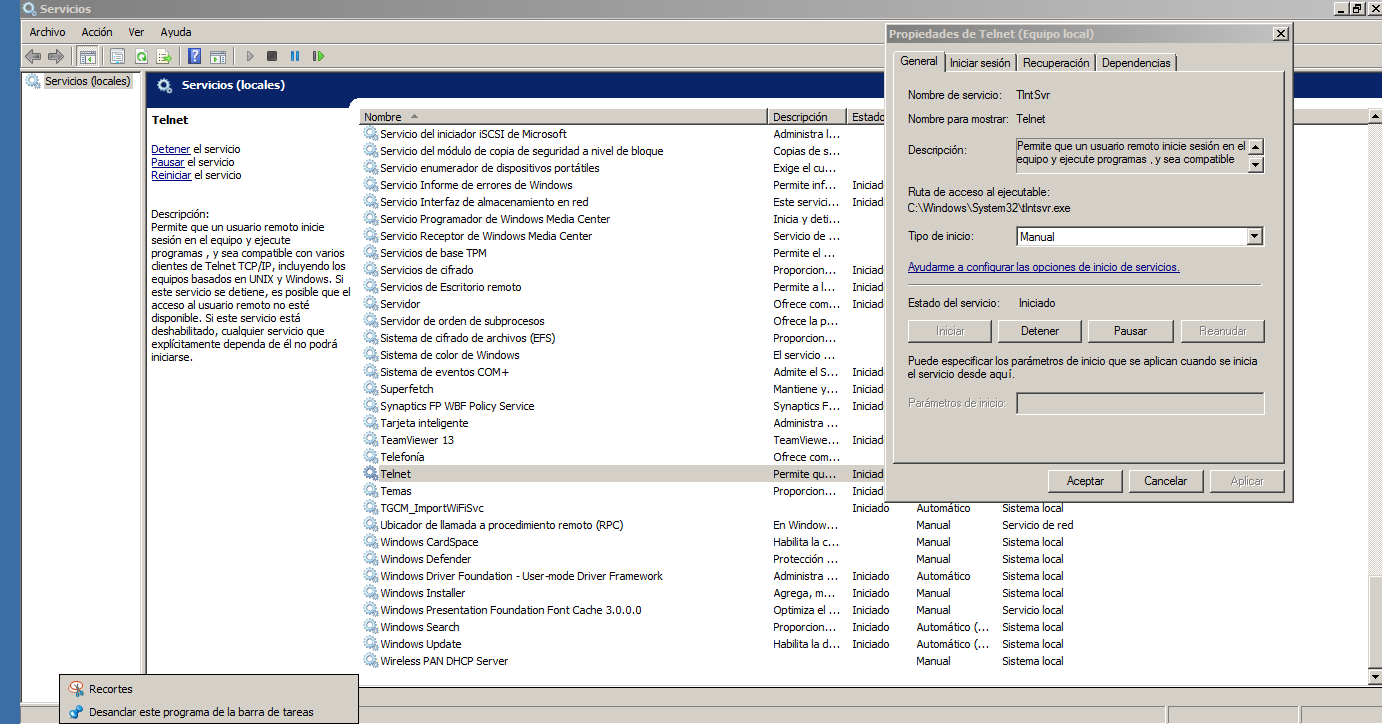 services.msc - Buscamos el apartado servidor Telnet -> Clic derecho -> Propiedades
