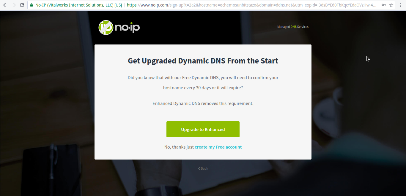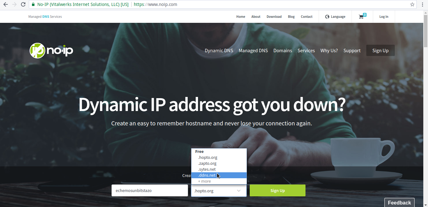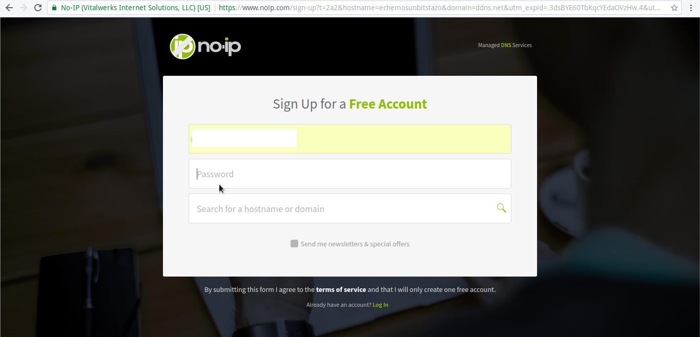 Existen muchos servicios en Internet que pueden darnos una IP fija como Dyn (antes DynDNS), no obstante, vamos a utilizar los servicios de No-IP.org. Este servicio te proporciona un subdominio a elección, y un dominio ya existente, con lo que, realmente accederás al dominio y no a una IP X con lo que será mucho más fácil acordarnos.